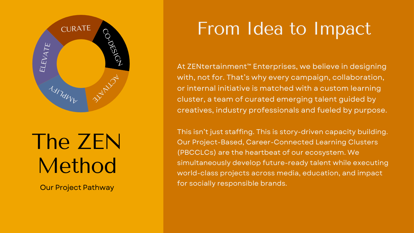 At ZENtertainment™ Enterprises, we transform personal narratives into collective impact. Born from our Founder’s journey through mental, financial, and physical challenges, our learning clusters embody the “it takes a village” spirit, uniting youth leaders, creatives, industry professionals, socially responsible brands to reshape education, entertainment, tech, wellness, and workforce innovation for all. Together, we create powerful connections that uplift communities and transform systems, proving that real change happens when no one stands alone.