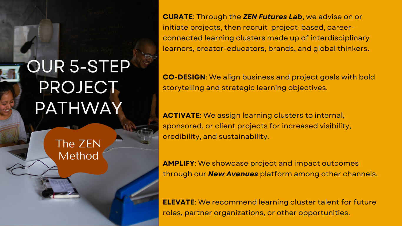 Through our companion platform (New Avenues) and creative incubator (ZEN Futures Lab), we help brands build authentic visibility while learners build market-ready skills and social networks. -